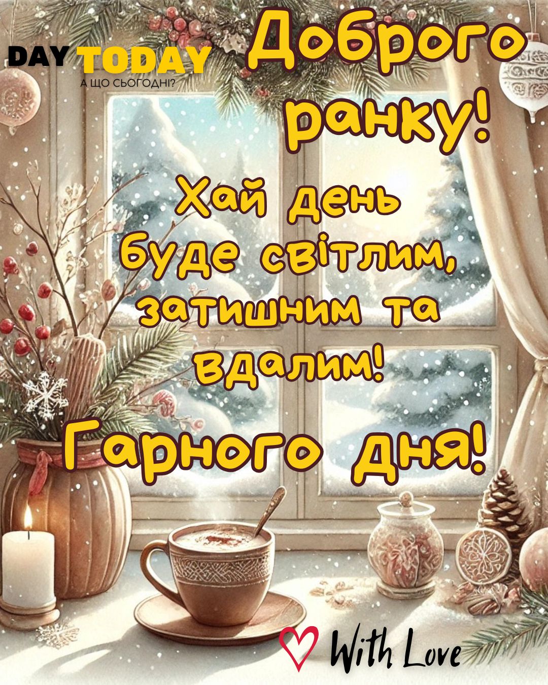 DAY TODAY листівки – найзатишніший каталог листівок українською мовою. Ми щодня створюємо нові теплі листівки та картинки, аби ви могли привітати своїх рідних та близьких в будь-яких соцмережах та месенджерах. Тисячі користувачів в Вайбері та Телеграмі вже отримали наші листівки.