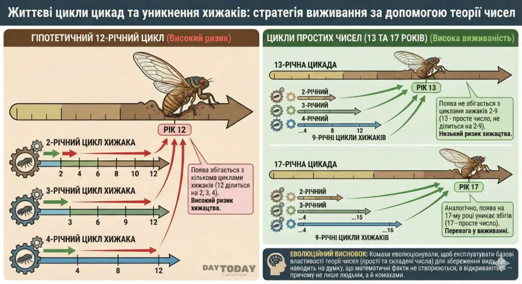 - Якщо життєвий цикл цикади складав би 12 років, то під час виходу на поверхню її зустріли б хижаки з 2, 3 та 4-річними циклами, оскільки 12 ділиться на всі ці числа без залишку.