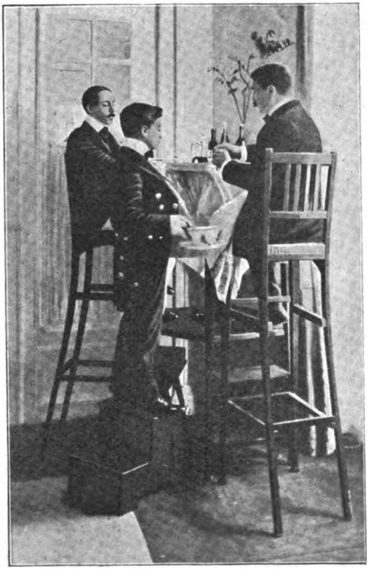 Практична реалізація ідеї «висотного обіду» вимагала переосмислення простору та залучення додаткових технічних засобів. Газета New York Herald описувала одну з таких вечерь 3, організовану Сантос-Дюмоном у Парижі того ж року. Конструкція та обслуговування цього заходу базувалися на кількох ключових елементах:
